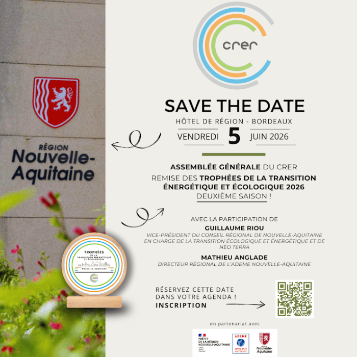 Le CRER vous invite à la remise des Trophées de la Transition énergétique et écologique en Nouvelle-Aquitaine 2026, le 5 juin 2026 à l’Hôtel de Région de Bordeaux.